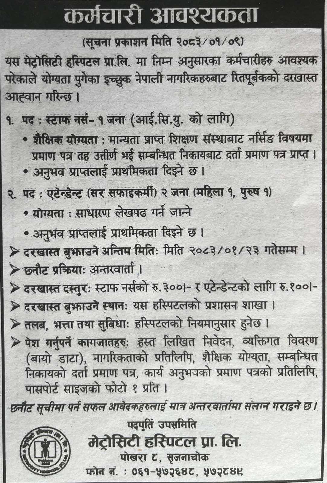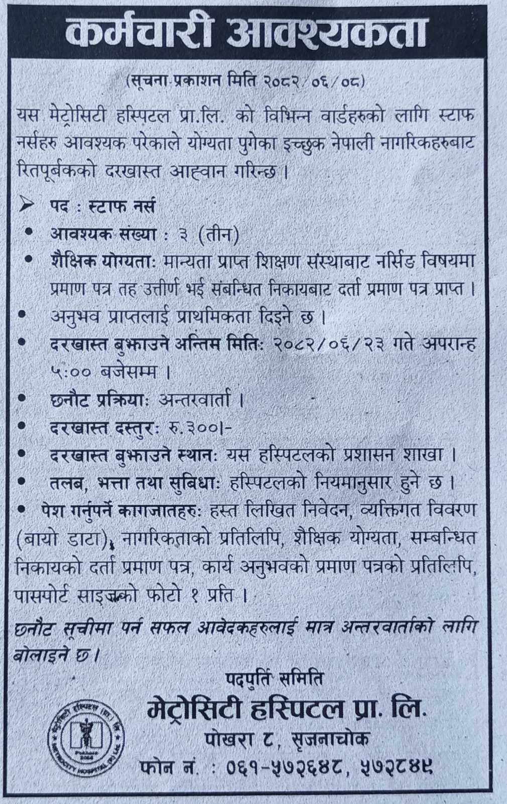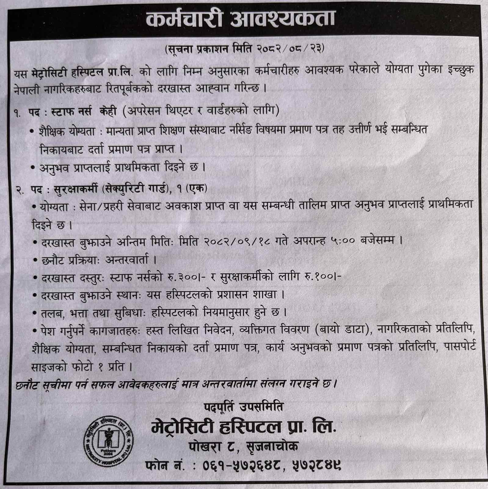 Welcome to Metrocity hospital. We are a registered and approved health care facilities provided in our region which is registered under the ministry of health and the local council of Pokhara metropolitan City.We are always been deliver the quality health service in affordable price from date of its operation. Our dedicated team has been consistently providing health service since 2010 in this region. We feel more responsible ourselves in being able to provide timely service to over three thousand patients every year. As a trusted partner of growing number of patients we have spent almost 10 glorious years; We are always committed to deliver quality health services for preventive, diagnostic or curative as per our patient’s needs. In our hospital there are 8 different departments orthopedic, General Medicine, Pediatric, Surgery , Radiology Gynecology, ENT and ophthalmology . We also provide 24 hours emergency, pathology, ambulance service including in house diagnostic facilities for CT scan, digital x-ray Ultrasonography services.We pride ourselves in being able to respond the community health issue as per the instruction and guideline provided from our monitoring authorities of Nepal Government ministry of health and population, Read more…..